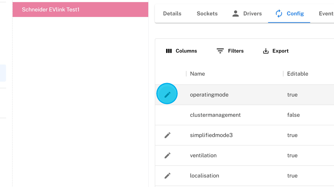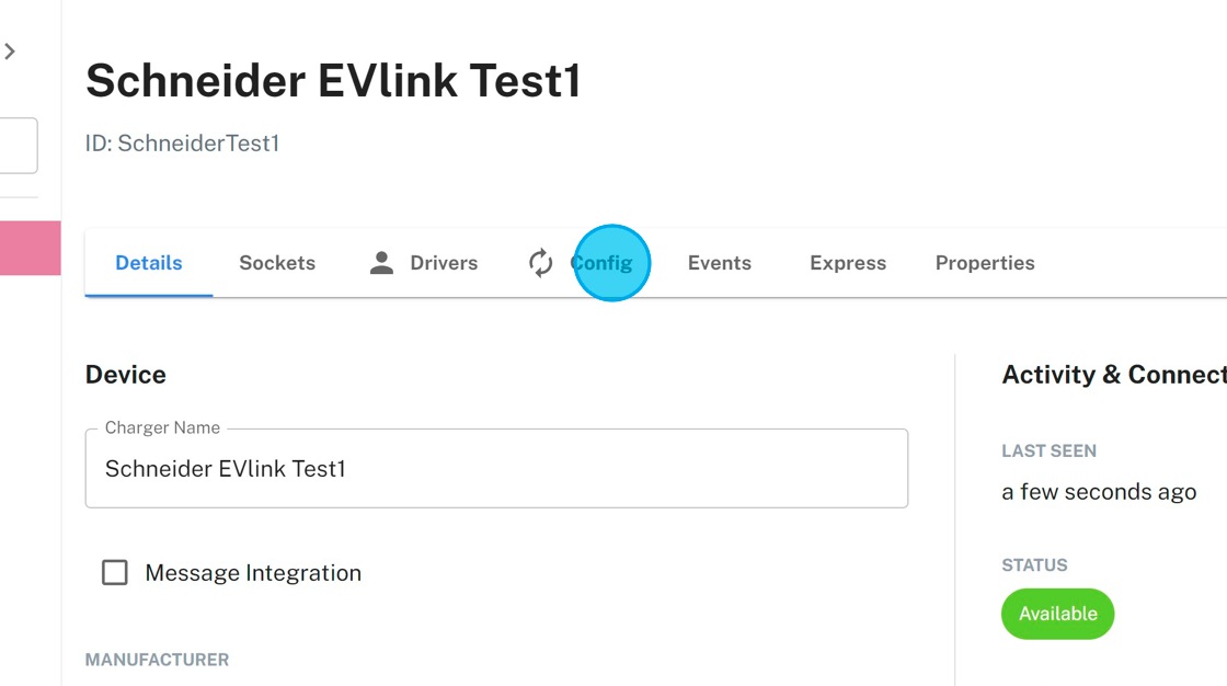 1. Navigate to the charger you want to update. Click "Config" to access charger's OCPP parameter configurations.