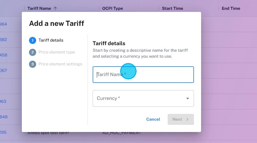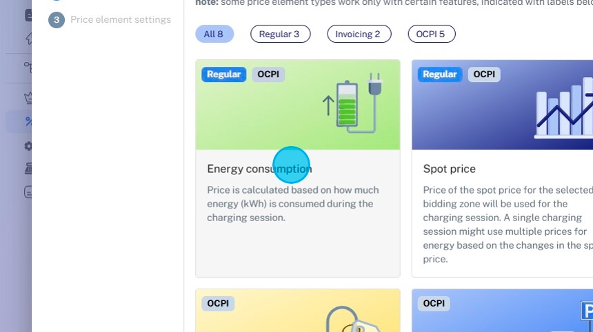 4. Every tariff consists of one or multiple price elements. Different price elements allows you to create versatile tariffs to match your pricing needs. When creating tariff we will start by adding the first price element for the tariff. Don't worry, you can add more price elements later! Click the desired price element type and continue with "Next"