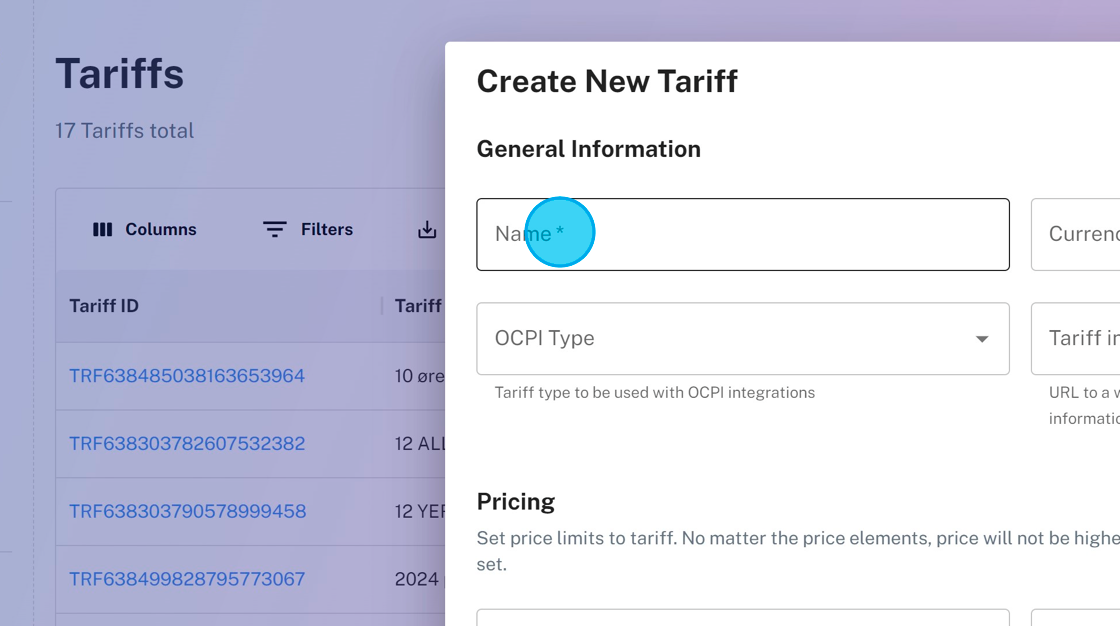 3. After payment terminal has been created, a tariff is needed. Create a tariff to be used in the charging sessions for the charger.