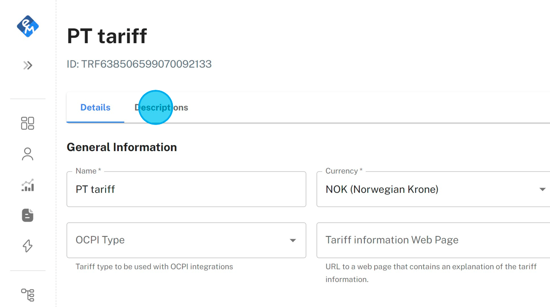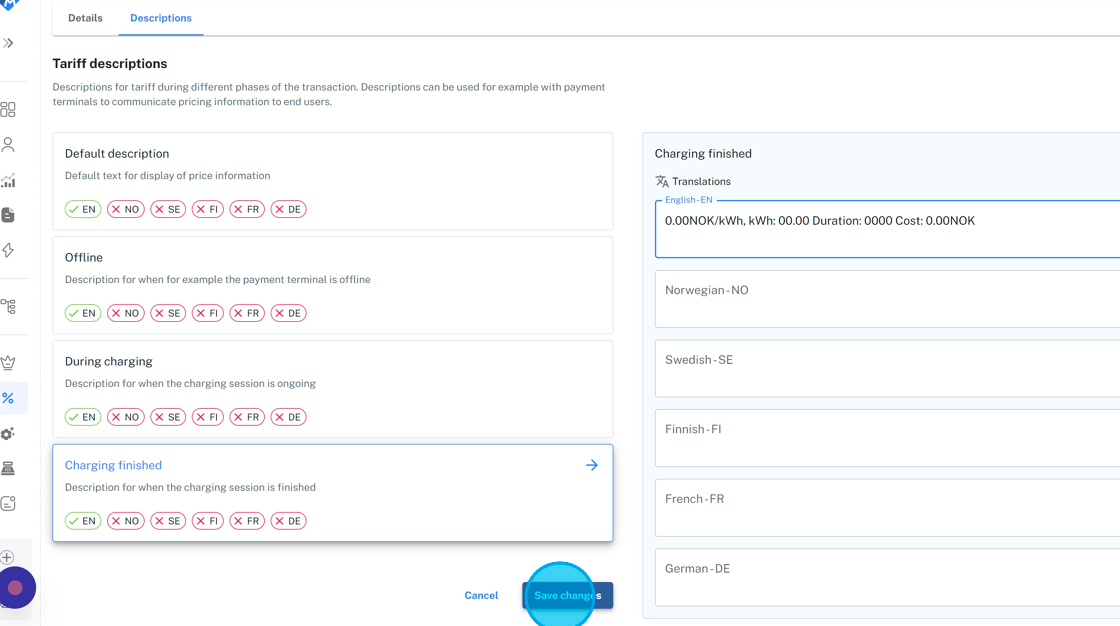 4. Click "Descriptions" and fill in wanted descriptions. Descriptions are used to tell what the payment terminal should have visible on the screen during different states of the charging sessions. Use the following templates to have automatically updating prices on the display (change language and currency accordingly):