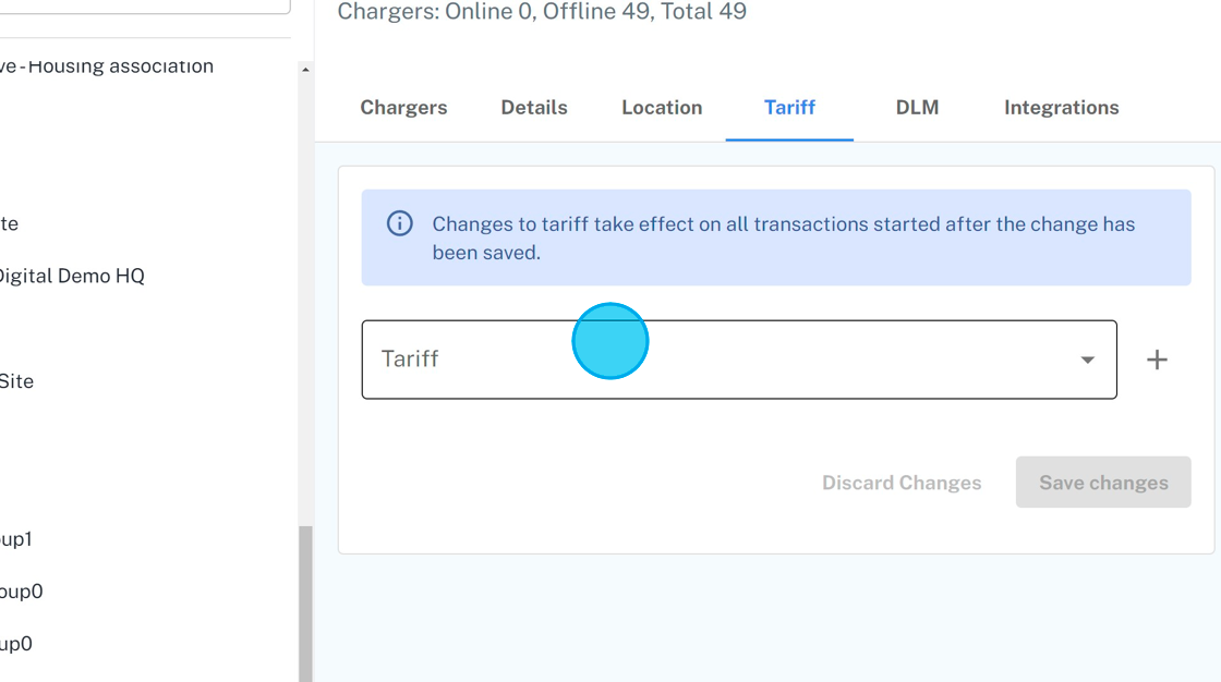 7. Set the tariff for the site. Tariff is used to calculate prices for the charging sessions happening in the site.